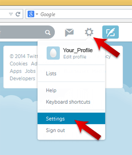 ![]() | On the upper right corner of the Twitter Page there is an Gear Icon. Click on the Gear Icon and select Settings option. |