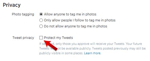 Under the Tweet Privicy make sure that Protect My Tweets option is not selected and click on the "Save" button. | |
